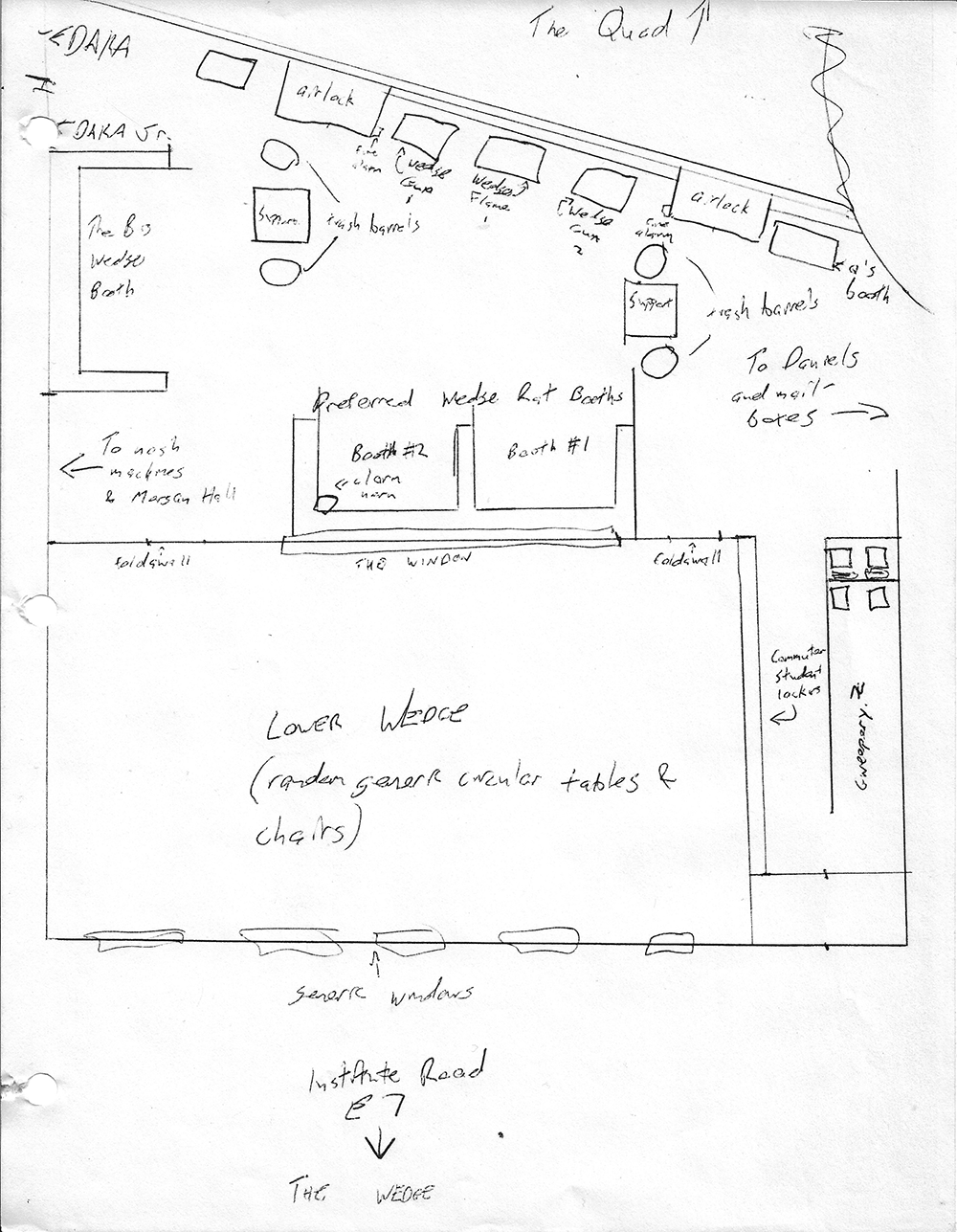 I thought this would be of interest here because one of the bonus items at the end, after a photocopy of the then-current WPI campus map, was a hand-drawn plan diagram of the Wedge as it existed at the time.