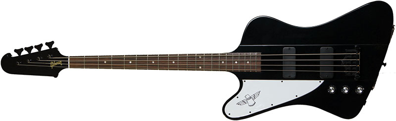 left-handed T-bird - A pretty rare bird, by all accounts, but they did in fact make some. The Thunderbird is interesting in that its neck actually runs the full length of the instrument (you can see the upper seam in the photo). Corwin's is a Thunderbird IV, which means it has two pickups.