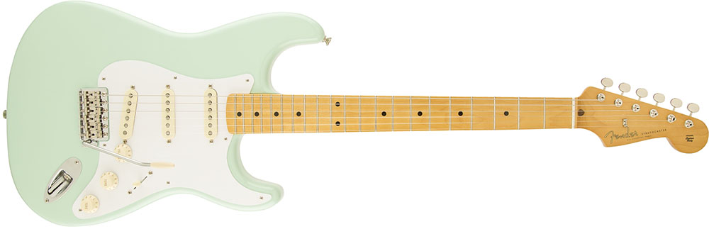 Surf Green - Ui's guitar is a Fender Zipang "Classic Reissue" Stratocaster - the same model Korra plays, in fact. It's similar to the real-world Classic Series '50s Strat. (This has presumably gone into and out of production several times over the decades, so Ui's is probably technically a Classic Re-Re-Reissue. :) We can see from Ui's budget that Zipangi Fenders are priced similarly to the "Made in Mexico" Fenders of the present-day real world - you pay the real inflated premium prices for the ones made on Earth (particularly after the EA crackdown, when they get much harder to find elsewhere) and in New Avalon.