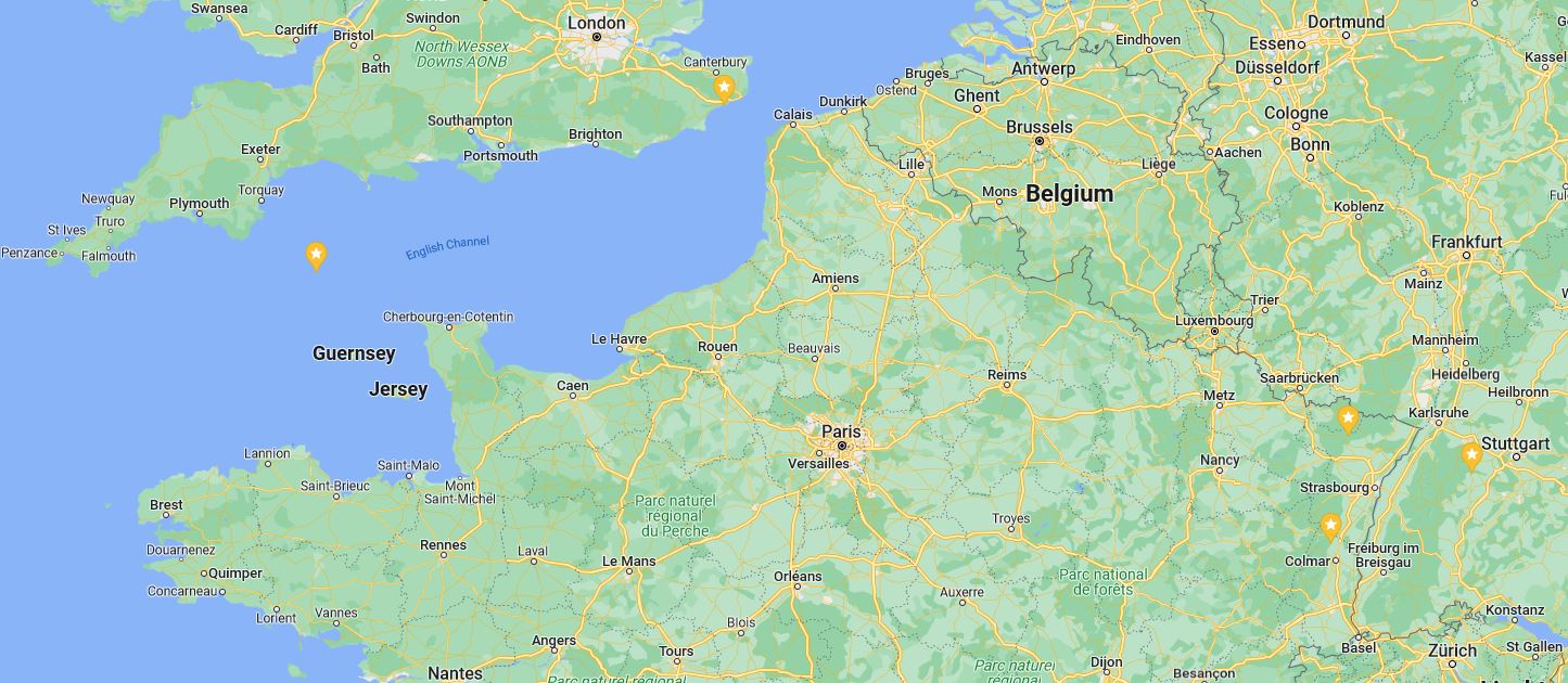 Several other notable places in the series are visible within the bounds of this map, though not specifically starred, including Colmar, just to the south of Saint-Ulrich; Freiburg, which is right across the Rhine to the east of Colmar; Paris, of course; Bruges, up on the Belgian coast; Le Havre, northwest of Paris, where Hyperion and Prinzessin Eugenie put in at the end of To Glory We Steer; and, in the lower right corner, the area in Switzerland between Zürich and Basel where Meiling and Flandre are currently having a bit of a hike. Also, this view is too zoomed out for the dot to appear, but the Fortress of Mimoyecques is a short distance southwest of Calais, right across the Channel from Folkestone.