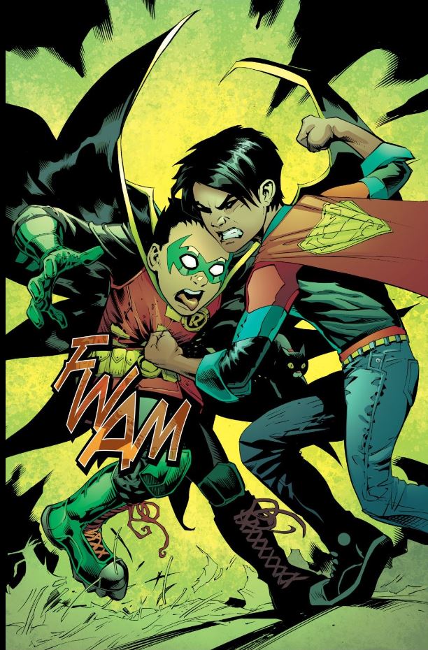 Honestly, the only thing wrong with this page is that Jon's fist isn't coming out of Damian's back.