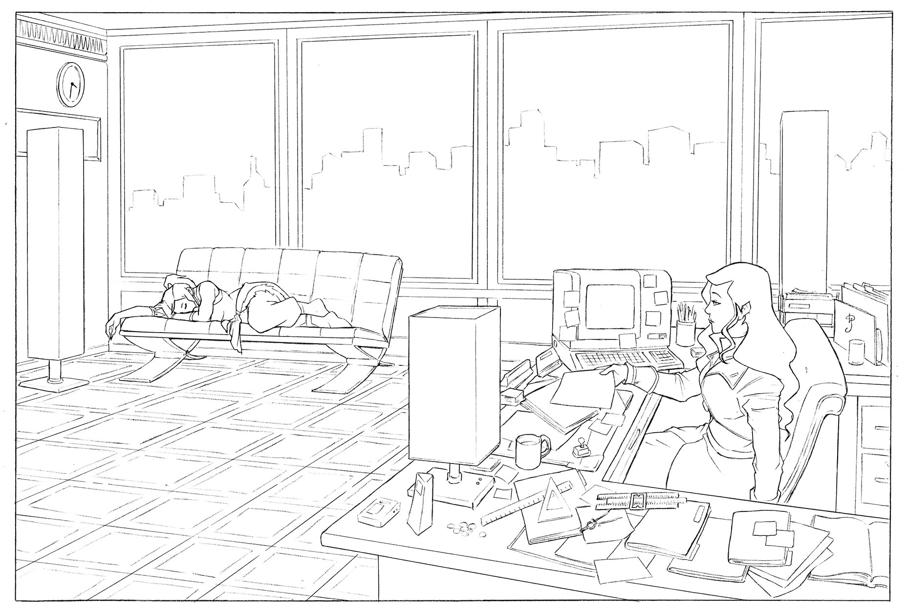 As part of a planned holiday test activity, I'll be posting a few fragments of the source lineart for what will be one of the illustrations in Challenging the Cold Silence over the next few days, with the complete picture coming out on Christmas Eve. It depicts a scene described (but not directly shown) in Chapter 4 of the book (which has previously appeared as a promotional excerpt), taking place in Asami's office at Project Phoenix Flight's Republic City offices on West Street in the early development phase of the project.Some of you will have seen this already, since the artist (Denise Jones) featured it on her deviantArt page. If you haven't, well, I suppose you can go find it there now if you don't want to wait, but that will make Korra sad, and hasn't she been through enough? Here's piece 1!
