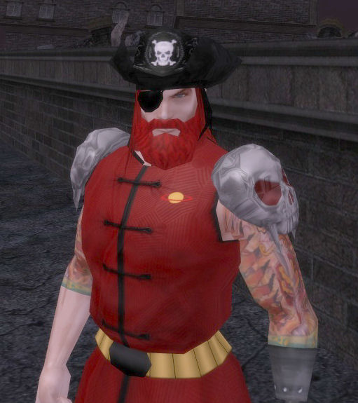 More than six feet tall, with long hair and a bushy red beard, and dressed in a swallowtailed red silk robe and baggy, gold-trimmed scarlet trousers, the last of the control room's invaders was a vibrant and colorful figure amid the silent grey and black figures of his crew. Though extensively disfigured by his life's work at a hard and dangerous trade - his right leg was a wooden peg from the knee down, his left hand was a large steel hook, and the patch over his right eye wasn't just for show - he seemed immensely strong and capable, as though he could whip everyone in the room without his crew to back him up and with his hook tied behind his back. His brocaded scarlet robe stretched across a barrel chest. A buccaneer's hat, complete with the traditional skull-and-crossbones badge, sat at a rakish angle on his head.